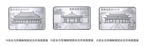 15 克长方形银质纪念币3枚,面额5元,长32毫米、高20毫米,每枚发行30万枚,3枚一共90万枚,背面图案分别采用紫禁城三大殿,即太和殿、中和殿、保和殿建筑造型。三大殿是整个紫禁城内建筑的核心。其中,太和殿是中国专制王朝建筑造诣集大成的代表之一,也是举行国家重大典礼的场所,每逢重大的节日,都会在这里举行隆重的典礼仪式。中和殿则是朝廷举行重大典礼时,皇帝先到此稍事休息的场所,他会在这里接受身边近臣、侍卫和典礼官的先行参拜。保和殿是皇帝宴请群臣的场地,也曾经是清朝殿试的考场。所以,从民族史、建筑史、文化史来说,气势恢宏、富丽堂皇的三大殿都承载着厚重的历史文化价值。