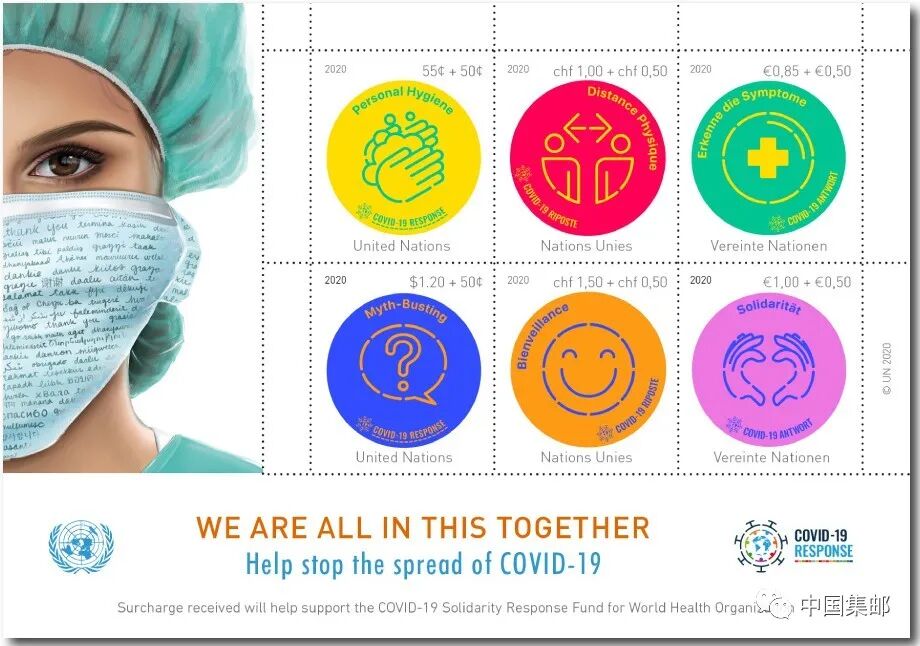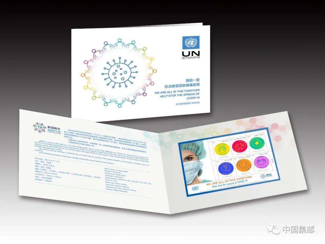 新型冠状病毒疫情给全世界公共卫生带来了巨大的挑战。联合国邮政于2020年8月11日发行“团结一致抗击新型冠状病毒疫情”附捐邮票小全张一枚。中国集邮总公司同时发行邮折一个。