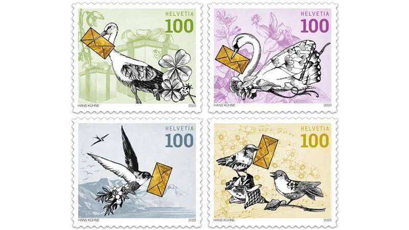 2020年7月24日,瑞士邮政发行一套四枚《特别问候》邮票。这是继2018年之后的第二组特别问候邮票,设计独特,用于婚礼、生日等祝贺问候,比如,鹳是代表小孩子出生的,天鹅代表着爱情,燕子一般是用于报丧或是退休等。