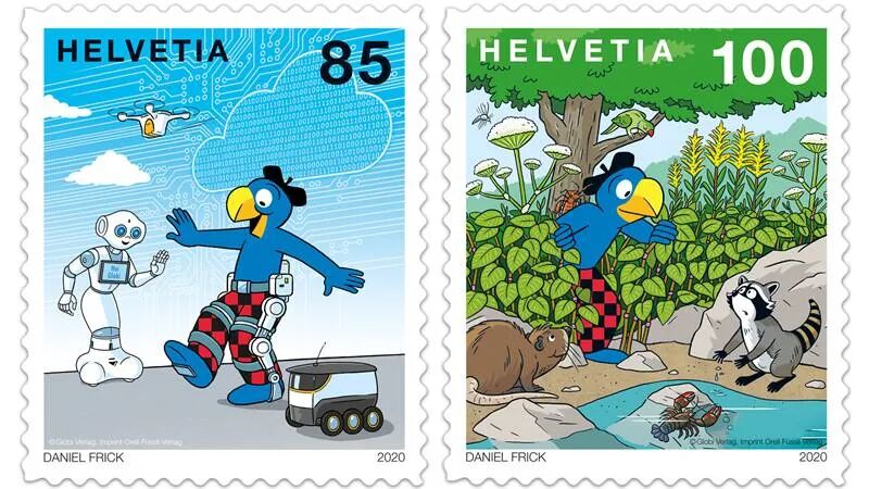 2020年7月24日,瑞士邮政发行一套两枚《卡通鹦鹉格鲁比》邮票。格鲁比是一只可爱又有趣的卡通鹦鹉,它有蓝色的身体、黄色的嘴、戴着贝雷帽和穿着红黑格子的裤子。这个最成功的瑞士卡通形象诞生于1932年,是很多儿童图画书、漫画、广播剧和电影中的主角,堪称瑞士的“米老鼠”。两枚邮票的图案分别选自今年出版的绘本《格鲁比和机器人》以及两年前出版的《格鲁比和新物种》。