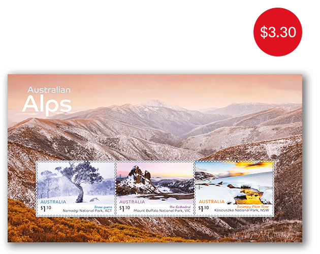 2020年7月21日,澳大利亚邮政发行一套三枚《澳大利亚阿尔卑斯山脉》邮票和一枚小全张。澳大利亚阿尔卑斯山脉是澳大利亚地势最高的山脉,位于澳大利亚东南部,横跨维多利亚州、新南威尔斯州和澳大利亚首都领地。这次发行的三枚邮票展现了纳玛吉国家公园、哥斯高国家公园和水牛山国家公园的美景。
