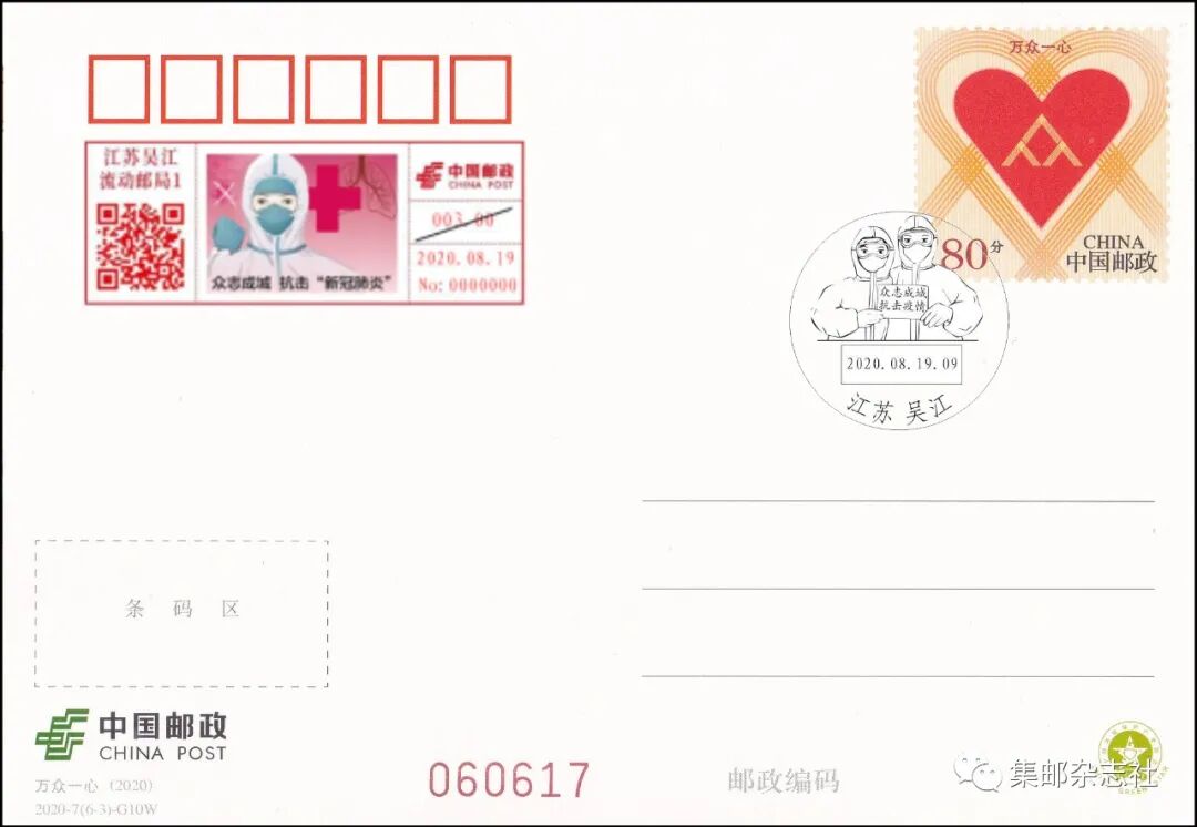 为了方便大家的收藏,《集邮》杂志微店今天上架了该枚文化日戳的实寄产品。届时《集邮》杂志将使用《万众一心》加印邮资明信片,盖销“众志成城 抗击疫情”文化日戳,使用“众志成城 抗击‘新冠肺炎’”邮资机宣传戳补资,在文化日戳试用首日挂号实寄给预订者。