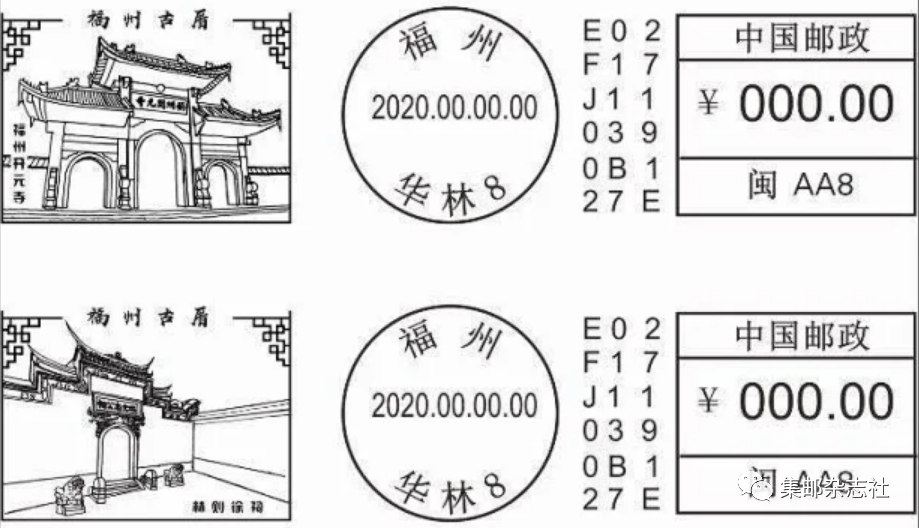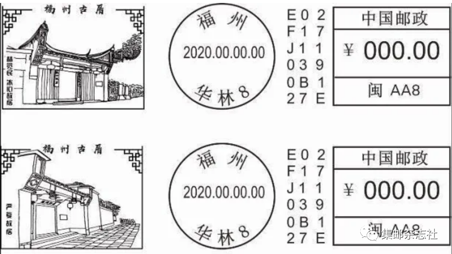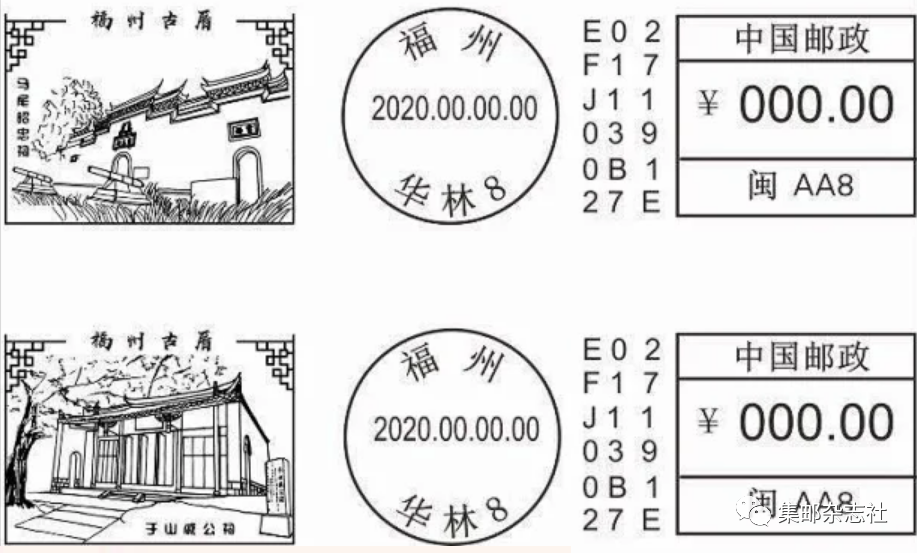 经中国邮政集团有限公司批准,福州华林邮政支局将于8月21日启用“福州古厝”系列邮资机宣传戳一组,图案分别为:林则徐祠、昭忠祠、福州开元寺、林觉民冰心故居、严复故居、戚公祠。