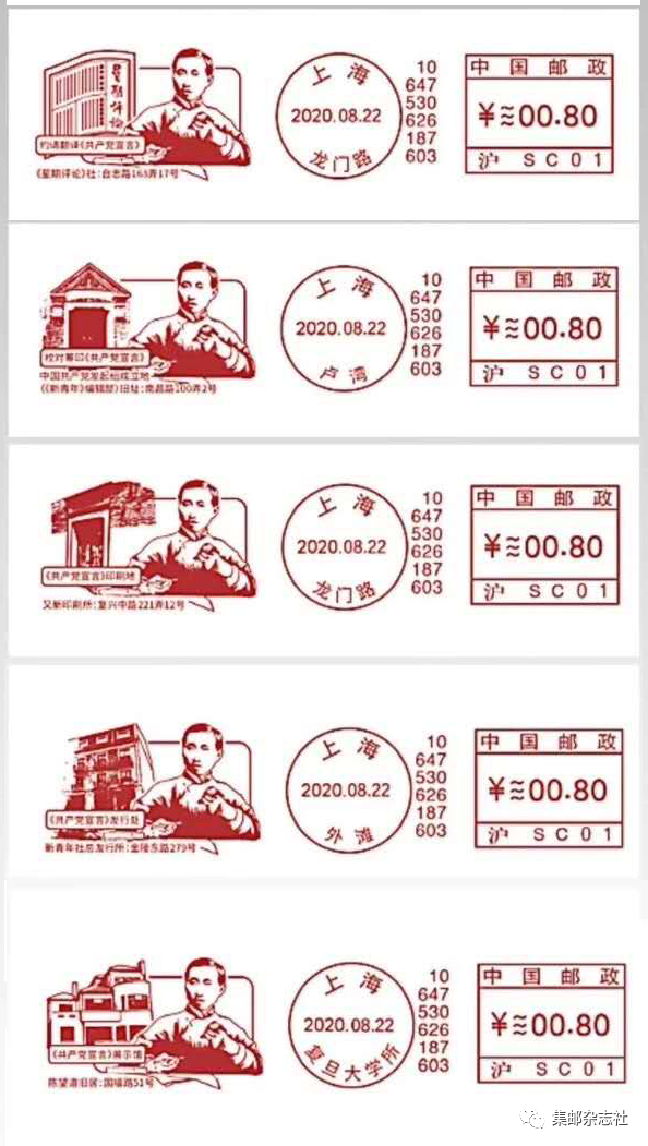 经中国邮政集团有限公司批准,上海邮政分公司将于8月22日在龙门路邮政支局启用“《共产党宣言》 约请翻译”“《共产党宣言》 印刷第”邮资机宣传戳各一枚;在卢湾邮政支局启用“《共产党宣言》 校对筹印”邮资机宣传戳一枚;在外滩邮政支局启用“《共产党宣言》 发行处”邮资机宣传戳一枚;在复旦大学邮政所启用“《共产党宣言》 展示馆”邮资机宣传戳一枚。