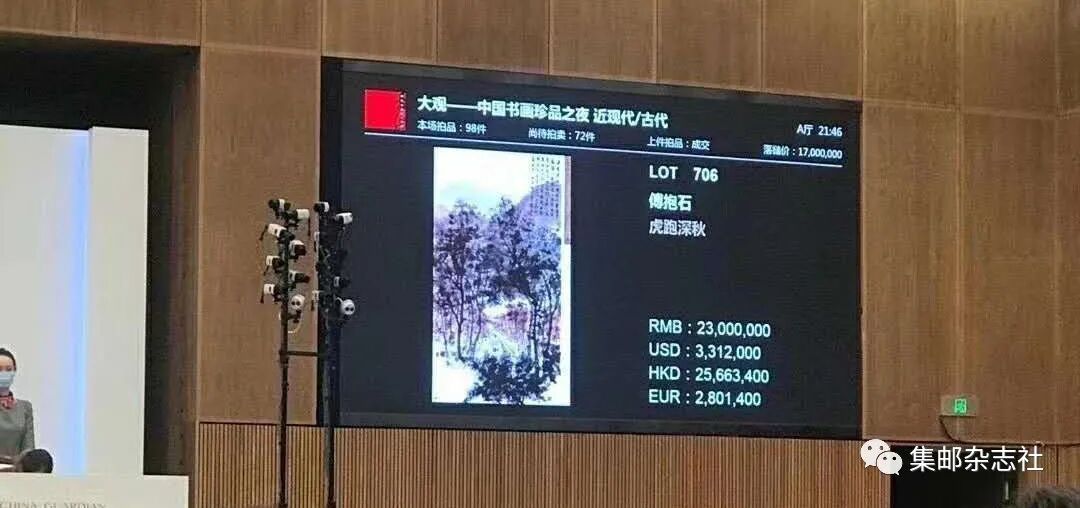 两幅邮资票品原作亮相今年的嘉德春拍。在8月16日“大观——中国书画珍品之夜”专场拍卖会上,傅抱石的《虎跑深秋》最终以2645万元(含15%佣金)价格成交。