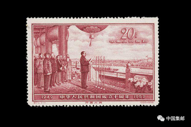 天安门是每个来北京的游客不可错过的憧憬之地。作为新中国的象征,天安门城楼是登上我国邮票次数最多的历史建筑,从1949年发行的新中国首套邮票《庆祝中国人民政治协商会议第一届全体会议》开始,天安门便多次出现在邮票中,跨越新中国各个历史时期。1959年发行的纪71《中华人民共和国成立十周年(第五组)》邮票因其图案及文字均取材于董希文创作的《开国大典》油画,被集邮者昵称为“开国大典”或“大典”。邮票描绘了新中国诞生的历史场景,画面中广场开阔、红旗如海,时任中央人民政府主席的毛泽东站在天安门城楼中央,庄严地宣读《中华人民共和国中央人民政府公告》。邮票以磅礴的气势,宏大的场面,记录了这一伟大的历史时刻。该邮票曾在1980年由《集邮》杂志主办的“中华人民共和国建国30周年最佳邮票”评选中得票位居首位,可见集邮者对其喜爱程度之深,体现了其在我国邮票史的重要地位。