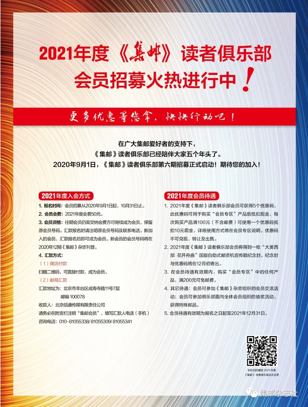 会员资格:往期会员仍需交纳会费方可继续成为会员,保留原会员号码。汇款报名时请注明原会员号码及联系电话。新加入的会员,汇款报名后即可成为会员。新会员的会员号码将在2020年12期《集邮》杂志刊登。