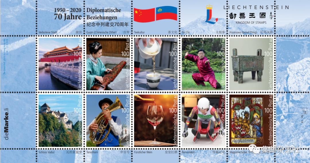 为纪念两国建交70周年,列支敦士登邮政将发行两国建交70周年邮票珍藏小版一版。邮票珍藏小版包含10枚邮票,图案分别为:故宫、瓦杜兹城堡、古琴、中音号、茶文化、皇室红酒、太极拳、雪橇运动、后母戊鼎、彩绘玻璃上的徽章。