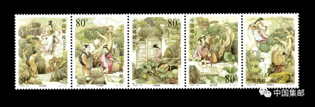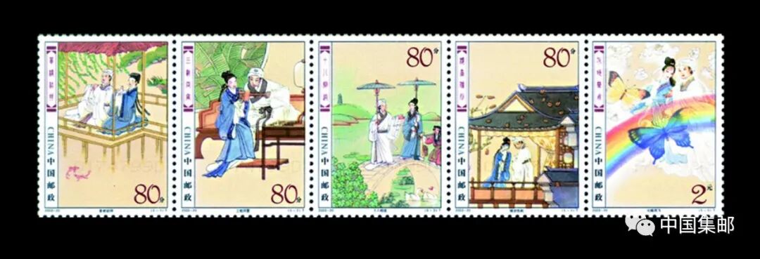 陆游有诗云:化蝶有残梦,焦桐无赏音。梁山伯与祝英台的故事家喻户晓,堪与莎翁笔下的罗密欧与朱丽叶称为古典东西方爱情故事双璧。梁祝二人用纵身一跃实现了生不同衾死同穴的誓言,化作一对翩翩的蝶,分明让人看见了一对古典的情侣,正出落成双飞的蝶,醉入花荫。这段千古绝唱的才子佳人的故事,在2003年被搬上了邮票的方寸空间。邮票通过草桥结拜、三载同窗、十八相送、楼台伤别、化蝶双飞五个画面,将梁祝的唯美哀伤的故事描述出来,尤其最后一枚化蝶双飞,一条彩虹横跨画面,梁山伯与祝英台幻化为两只蝴蝶在空中翩然而飞,邮票细腻的展现了爱情的美好,带来了更多的希望。