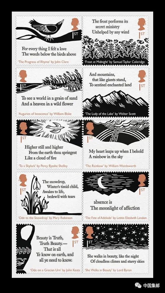 在西方古典世界中,爱情也是文学和艺术创作中最主要的表现内容之一,希腊神话、罗马神话的诸多内容皆和爱情相关,莎士比亚的《罗密欧与朱丽叶》,小仲马创作的《茶花女》,夏洛蒂·勃朗特的《简·爱》,简·奥斯汀创作的《傲慢与偏见》,这些爱情故事都登上过邮票的方寸舞台,2020年英国皇家邮政为了纪念浪漫主义诗人威廉·华兹华斯诞辰250周年,发行了一套以浪漫诗词为主题的邮票,选取了十位浪漫派诗人的代表名句。