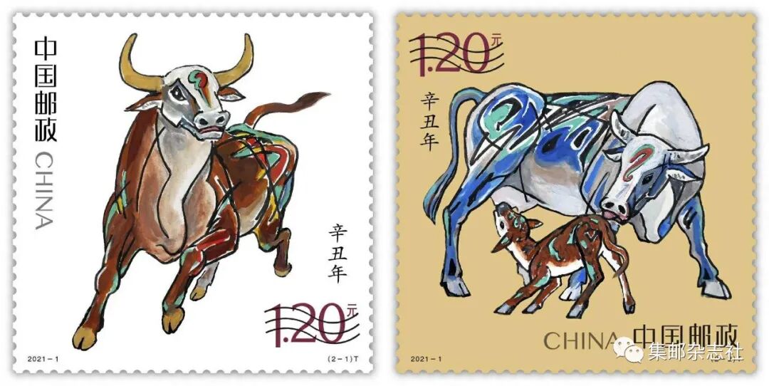 《辛丑年》特种邮票是中国生肖邮票序列第四轮中的第六套,由著名画家姚钟华先生创作,延续了第四轮生肖邮票的“家国”理念,一套两枚分别展示了国家的期许、家庭的企盼,组合而成浓浓的新春祝福。其中,第一枚名为“奋发图强”,描绘了雄壮有力、一往无前的奔牛形象。公牛四蹄扬起,昂首向前,目光炯炯,表达出不畏艰险、砥砺前行,为实现中华民族伟大复兴而努力奋斗的寓意。第二枚名为“牛年大吉”,通过大牛与小牛舐犊情深的温馨画面,向全国人民传递家庭兴旺和谐、团圆美满的美好祝愿。《辛丑年》特种邮票通过动与静、力量与温情的结合,将生肖牛“脚踏实地、敢于拼搏、开拓进取、勤劳奉献”的精神内涵进行了生动诠释与艺术展现。《辛丑年》特种邮票使用胶印雕刻联合印刷方式呈现,由邮票印制局青年设计师刘博雕刻。雕刻版呈现的图案细节更加丰富、细腻,配合鲜艳的色彩搭配,使整体图稿显得典雅、庄重。邮票采用了生肖专用防伪邮票纸,“版式一”运用无墨雕刻呈现生肖诗句,彩色胶印变频技术和红色荧光防伪油墨兼具防伪性与艺术性。活动现场还启动了中国邮政2021年新邮预订和2021中国邮政辛丑年生肖文创大赛暨生肖邮票IP授权项目。著名艺术家韩美林、“时代楷模”其美多吉、表演艺术家六小龄童、篮球运动员马布里等社会各界人士送上了对于牛年的祝福和期待。据悉,2021年中国邮政将继续坚持“总量调控、适度从紧”的纪特邮票发行原则,适度调减2021年邮票发行量,其中《辛丑年》特种邮票各版式的计划发行量都将低于上年。2021年1月5日,《辛丑年》特种邮票将正式上市发售。