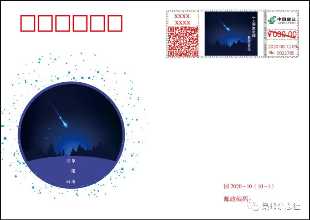 中国邮政将于9月18日在北京市和平里邮政支局启用“十大天象奇观”自助式邮资机宣传戳一组10枚,编号:国2020-10,该组自助式邮资机宣传戳限量加盖6000套。图案分别为象限流星雨、月球后的火星、金星的“荣耀之夜”、一年中最大的满月、日环食、英仙座流星雨、十月的火星、双子座流星雨、日全食、木星与土星的“伟大结合”。