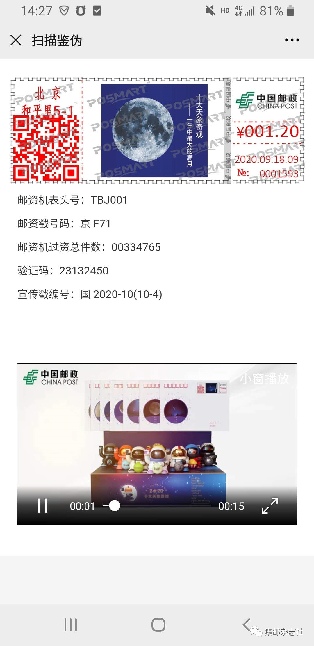 该套邮资机宣传戳为首套带有可视视频的自助式邮资机宣传戳。您用手机扫描自助式邮资机宣传戳左侧的二维码,除了可查阅防伪信息外,还可观看与该套邮资机宣传戳相关的视频。