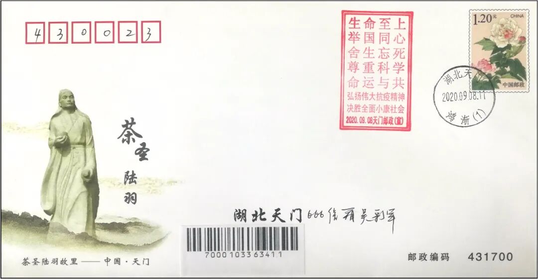天门邮政启用“弘扬伟大抗疫精神,决胜全面小康社会”宣传戳一款,在鸿渐邮政支局和“茶和天下”主题邮局提供加盖。
