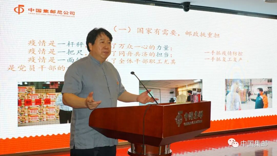 刘爱力董事长曾用“六个前所未有”评价邮政在疫情防控中的表现。任永信以亲身经历讲述了疫情以来中国邮政、湖北邮政在最危险的第一线担当国企重任的感人事迹。从1月25日中国邮政宣布“四不中断、四免费办”,到为2.9万余名援鄂医疗队员提供免费寄递服务、为一线人员提供免费保险,为抗击疫情累计捐赠约1.6亿元,以实际行动体现“国家有需要,邮政挑重担”的承诺。湖北邮政与湖北人民一起,经历了封城、隔离、守望、相助,见证了天使、逆行,感受了同舟、共济,彰显了“国家队”的使命、担当。中央电视台、人民日报等120余家媒体累计报道湖北邮政的稿件超过5400篇(条)。疫情是一杆秤,称出了万众一心的力量;疫情是一把尺,量出了同舟共济的担当;疫情是一面镜,照出了全体干部职工尤其是党员干部的责任和使命。2020年5月11日,中国邮政特别发行了《众志成城抗击疫情》邮票。正如刘爱力董事长所指出的,这“就是用‘国家名片’讲述感人的中国抗疫故事、致敬英雄的中国人民、展现磅礴的中国力量、弘扬伟大的中国精神。”