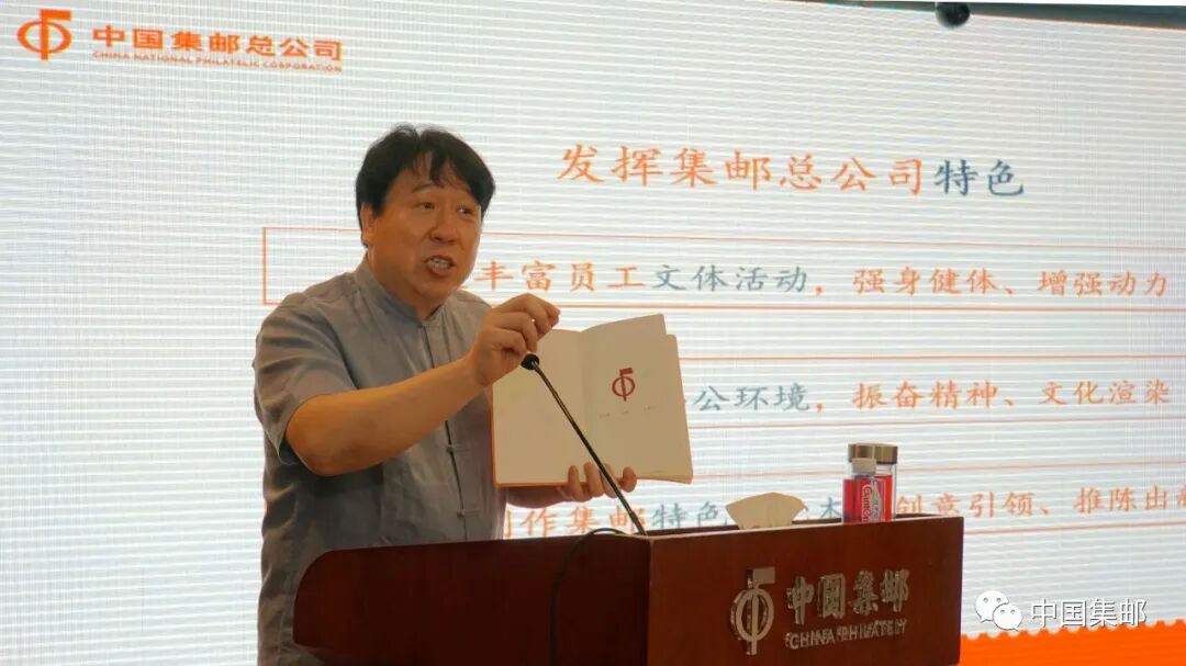 任永信拿起刚刚发放到每个员工手中的集邮文化笔记本,介绍第一页上展示的总公司标识:邵柏林老师为总公司设计的标识有三个元素,放大镜象征宽视野、邮票齿孔彰显大格局、镊子体现重细节,只有拓宽视野、提升格局、注重细节,才能做好中国集邮的事。