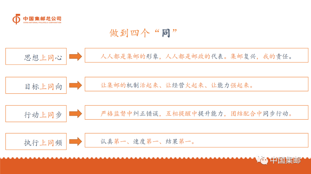 做到四“同”,一要思想上同心,人人都是集邮的形象,人人都是邮政的代表,人人都要扛起集邮复兴的责任。二要目标上同向,共同让集邮的机制活起来、让经营火起来、让能力强起来。三要行动上同步,要相互配合,协同共进,各司其职,相互提醒。四要执行上同频。同频才能共振,要做到认真第一、速度第一、结果第一。