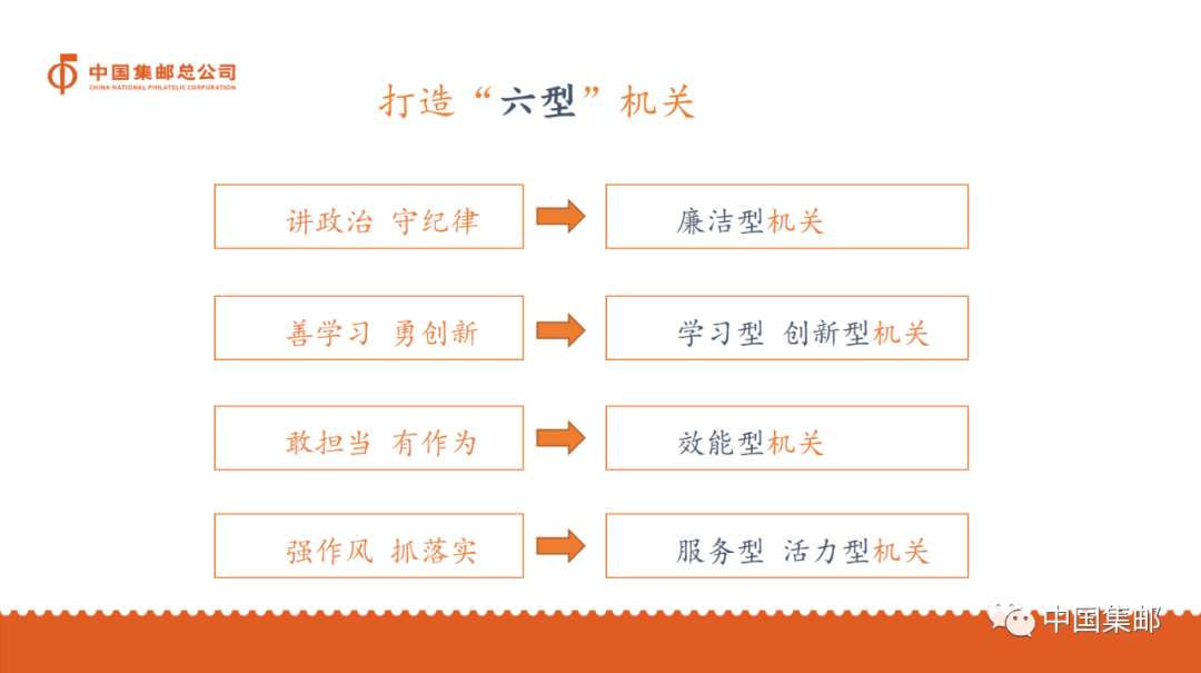建设“六型”机关,一要讲政治守纪律,建设廉洁型机关。知敬畏,筑牢心存敬畏的高压线;存戒惧,筑牢严于用权的警戒线;守底线,筑牢正心修身的防范线。二要善学习勇创新,建设学习型、创新型机关。坚持理论学习强信念、业务学习增能力、学用结合促创新。每年要举办1-2次创新大赛,鼓励全体员工特别是青年员工发挥聪明才智,创新邮票邮品设计、改进工作方式方法,把员工创意与生产力提高结合起来。三要敢担当有作为,建设效能型机关。敢担当不只是会表态。鹰和鸵鸟的寓言告诉我们对问题不能视而不见、充耳不闻,要警惕鸵鸟现象。刻舟求剑最大的问题就在于思想还停留在过去。要认真思考我们集邮这张旧船票还能否登上新时代文化发展的快船。四要强作风抓落实,建设服务型、活力型机关。总公司要为各省公司服务,集邮网厅要为客户服务。要提升服务意识和服务本领,深入基层、走进市场、走进客户。经营企业就是经营人心,经营人心重在文化润心,要关爱暖心,执行用心。员工家属生日、员工子女考上大学,都送上一份集邮总公司特色贺礼就是让关爱温暖每个员工的心。