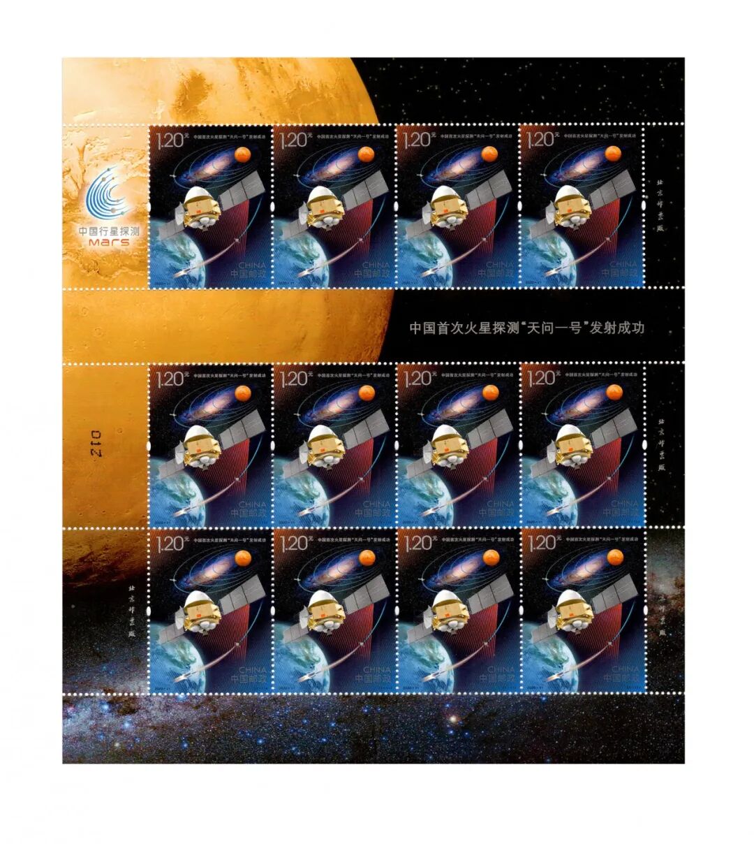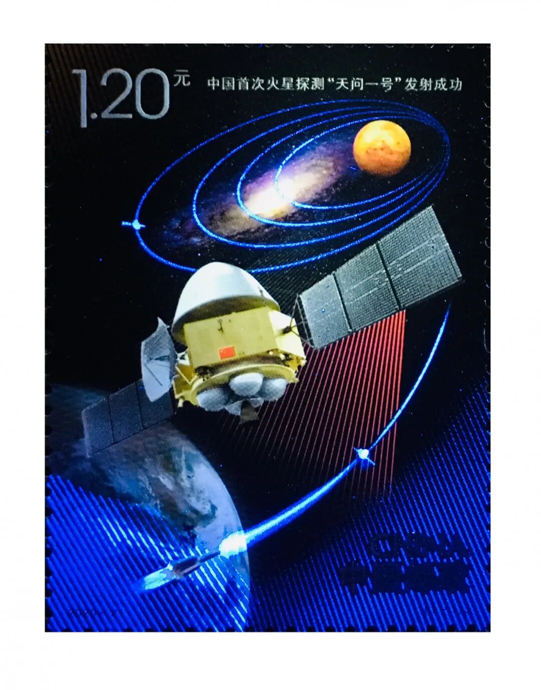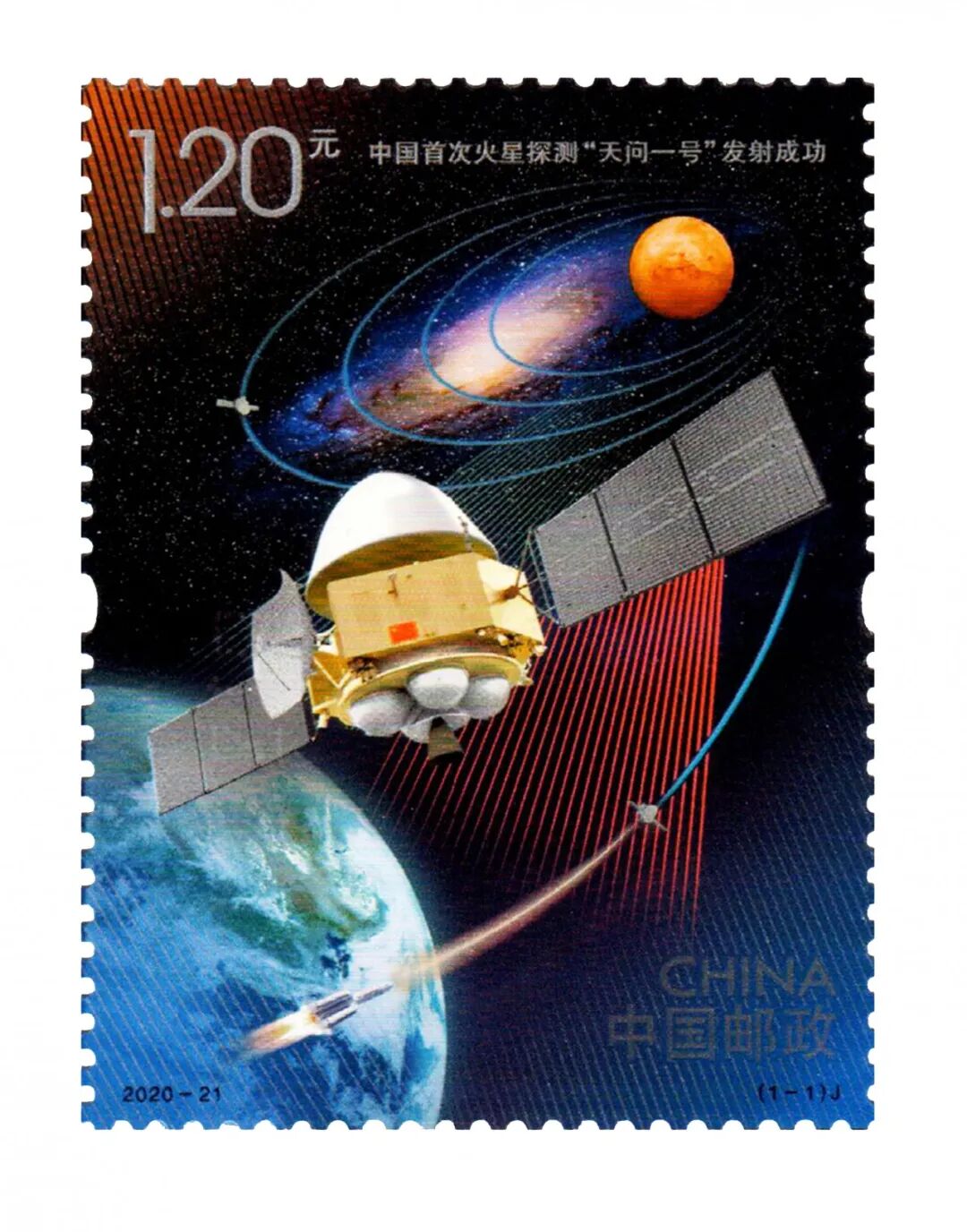 《中国首次火星探测“天问一号”发射成功》纪念邮票,图案名称为:中国首次火星探测“天问一号”发射成功,邮票面值为1.20元。计划发行数量为780万套。