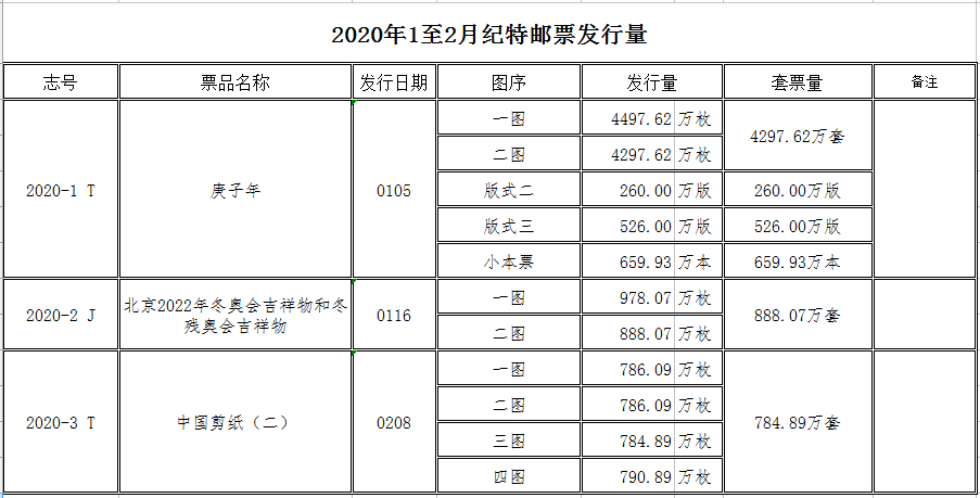 《庚子年》 (2-1)4497.62 万枚 (2-2)4297.62 万枚 4297.62万套 版式二260.00 万版 版式三526.00 万版 小本票659.93 万本