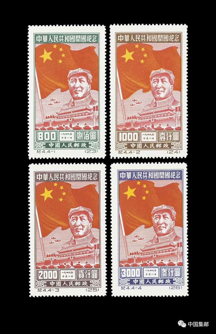 1950年7月1日发行的《中华人民共和国开国纪念》邮票,一套四枚,除面值和颜色不同外,图案均采用开国典礼的情景。