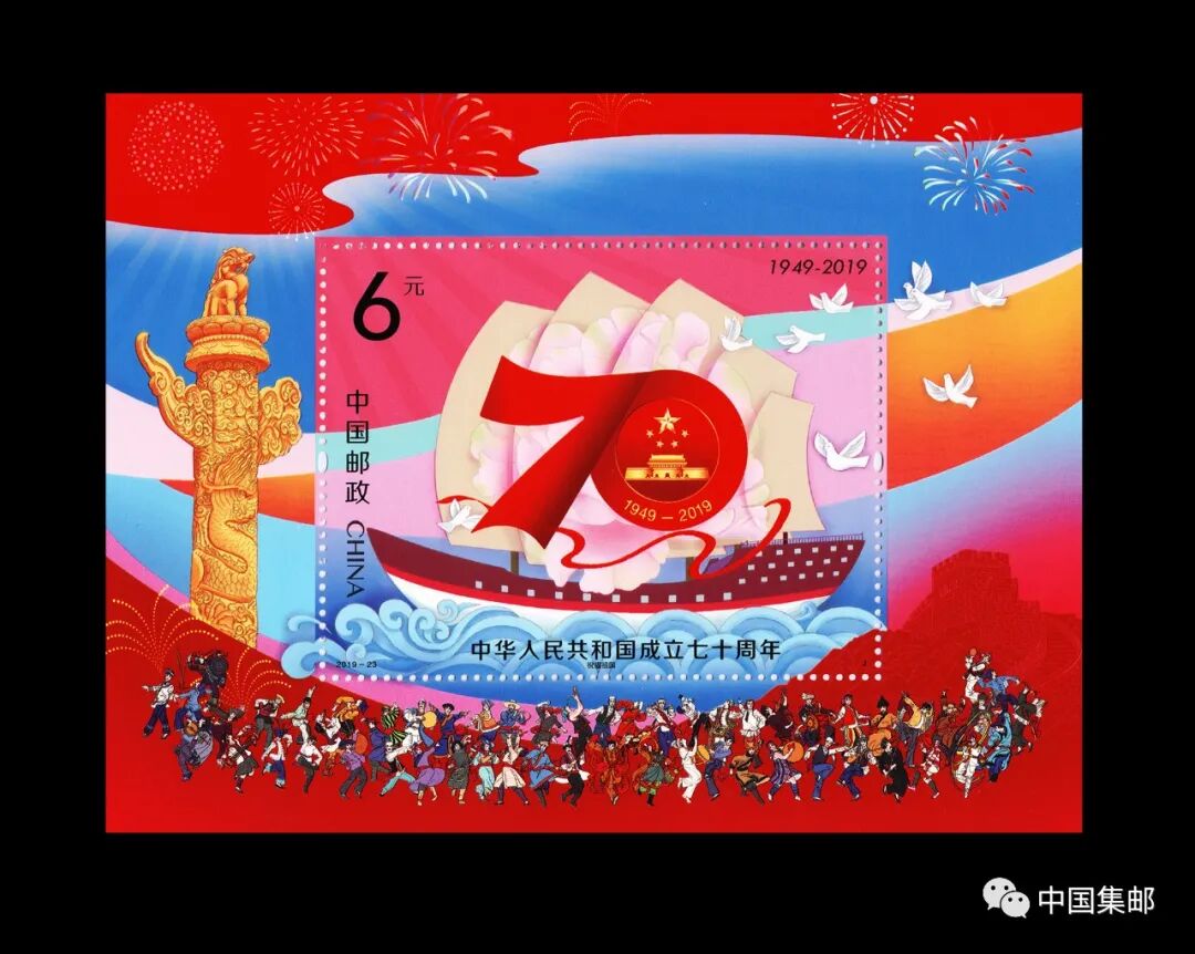 小型张邮票图案为衬以牡丹花图案的数字“70”以及扬帆起航的巨轮,边饰图案则以各族人民载歌载舞的欢庆画面,表现祝福祖国70华诞的寓意。