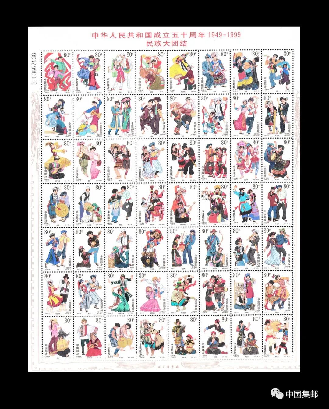 在中国共产党的正确领导下,全国各族人民和睦相处,共同进步,成为繁荣昌盛的社会主义大家庭。该邮票共有56枚,展现的是我国的56个民族。每枚邮票代表一个民族,印制在一张整版上,是新中国迄今为止枚数最多的一套邮票。