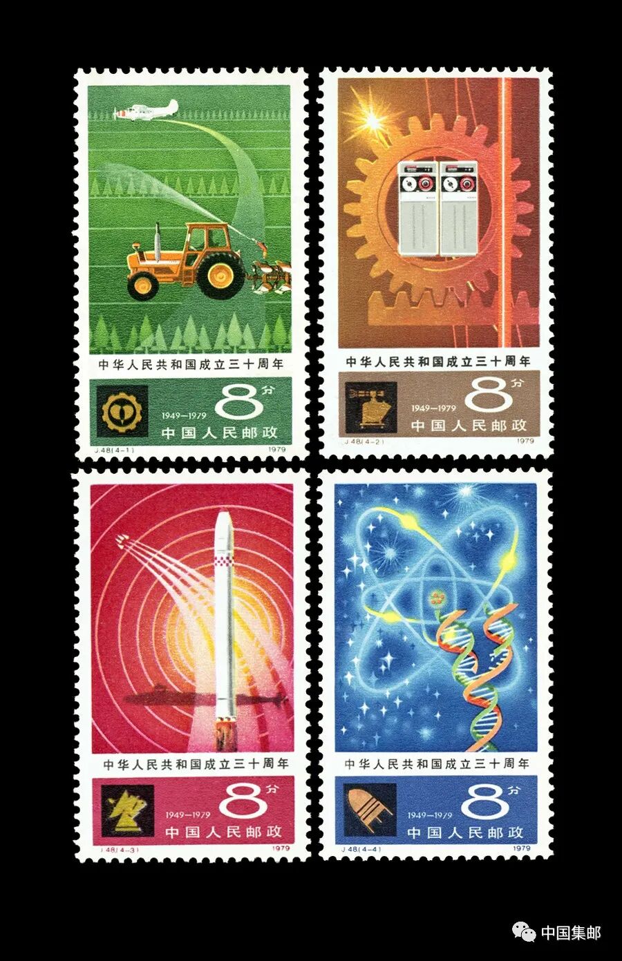该套邮票的4枚图案,统一用票名"中华人民共和国成立三十周年”分隔成上下两个部分;面值和铭记统一置于右下角,左下角分别绘有农业、工业、国防和科学技术现代化的象征物;上部为中心画面,分别展现出了中国农业、工业、国防和科学技术四个现代化建设取得的成就。