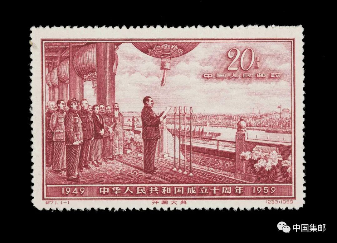 新中国成立十周年纪念邮票共发行了5组19枚,是新中国成立以来发行国庆邮票最多的一年,其中第五组邮票全套一枚,以董希文油画《开国大典》为主图,深受世界集藏者喜爱。