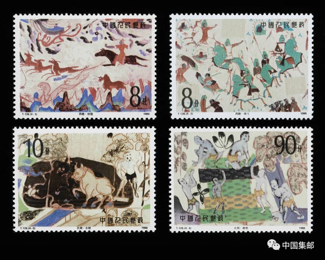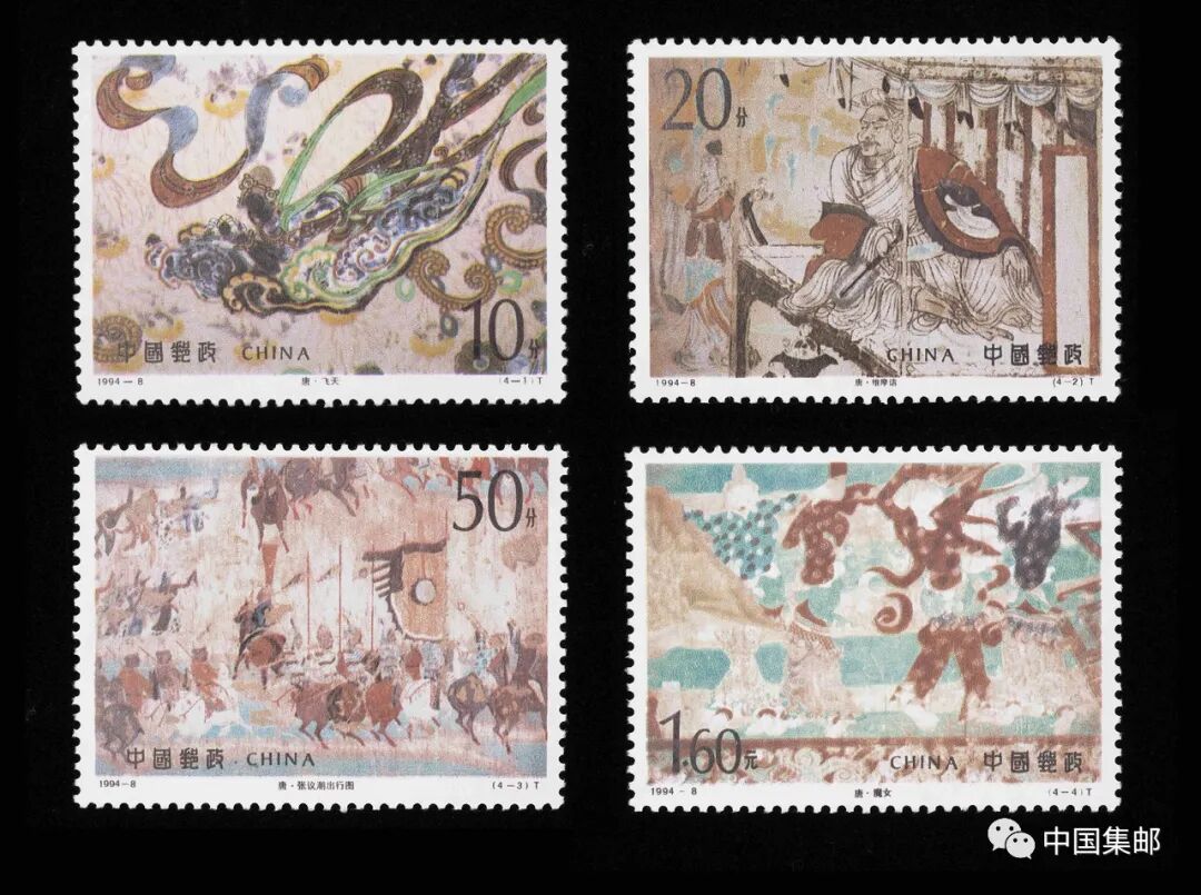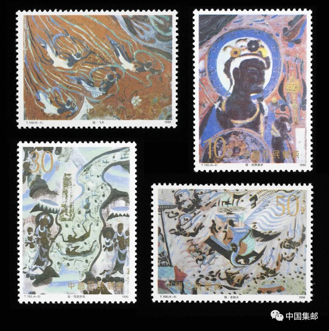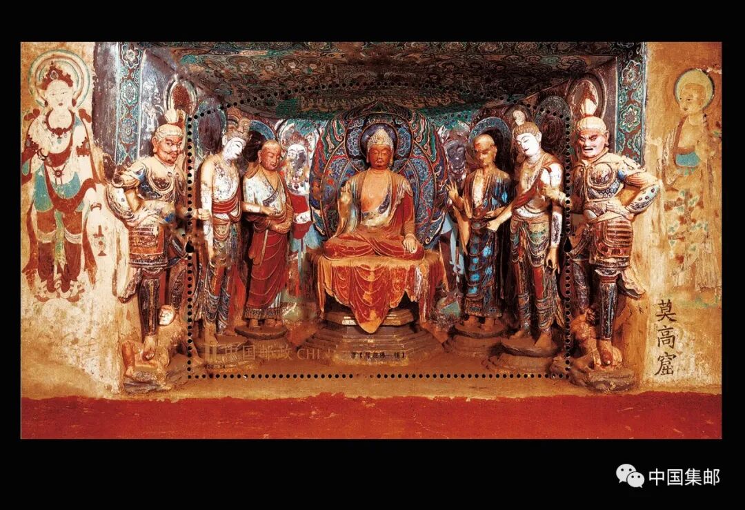 在四枚邮票和一枚小型张上分别表现了从北魏到晚唐几百年间最具有代表性的莫高窟壁画和雕塑艺术作品,彩塑佛像面容安详,姿态典雅;壁画设色浓丽,绘制精美,分别代表了这几个时代最杰出的造像艺术水准。