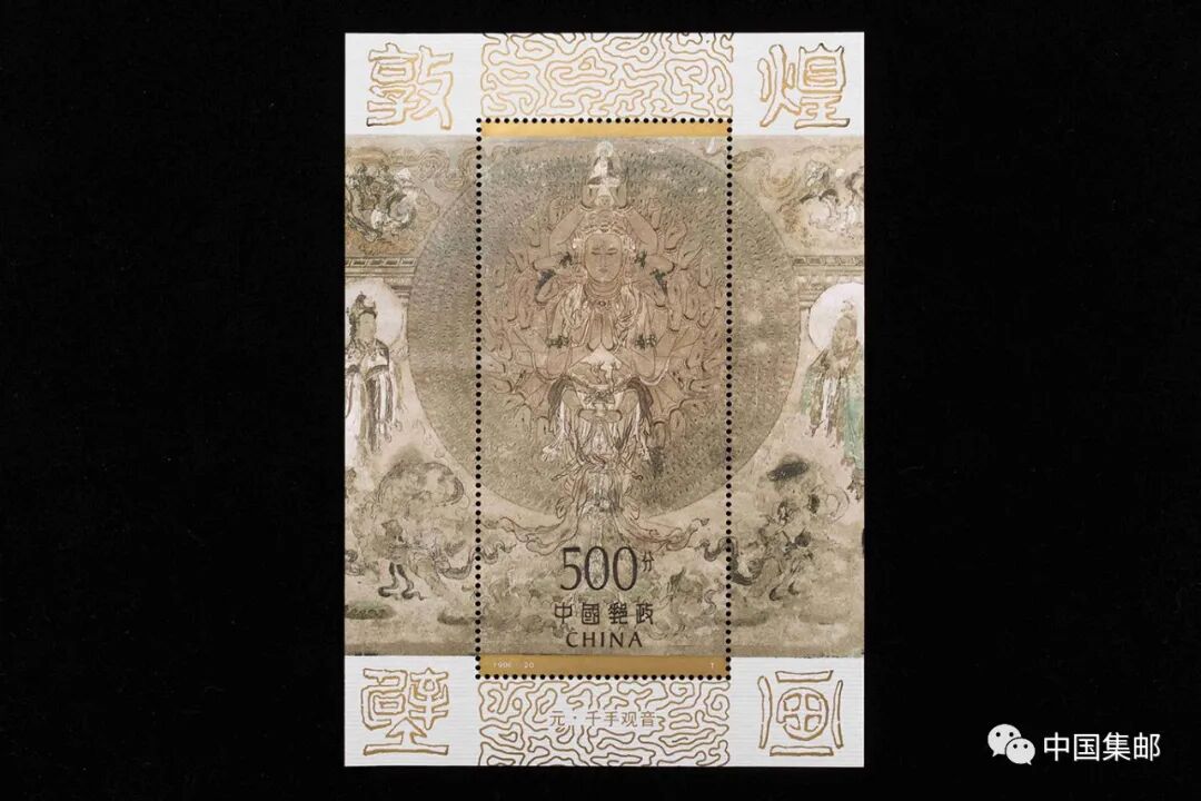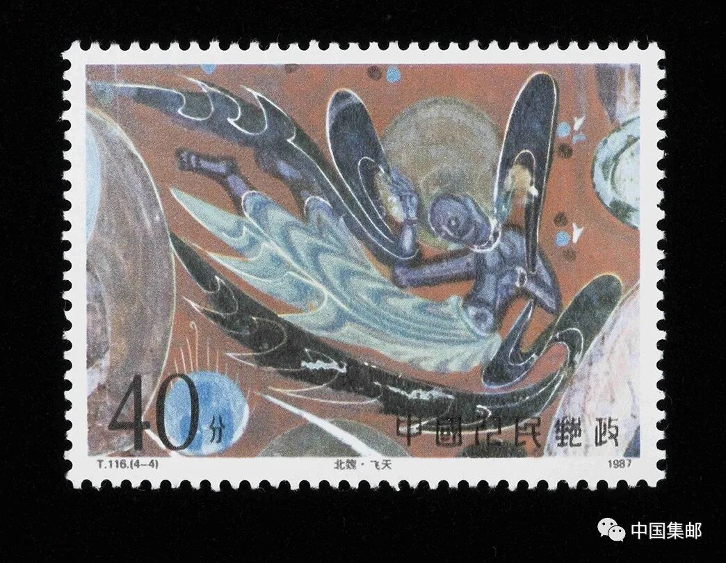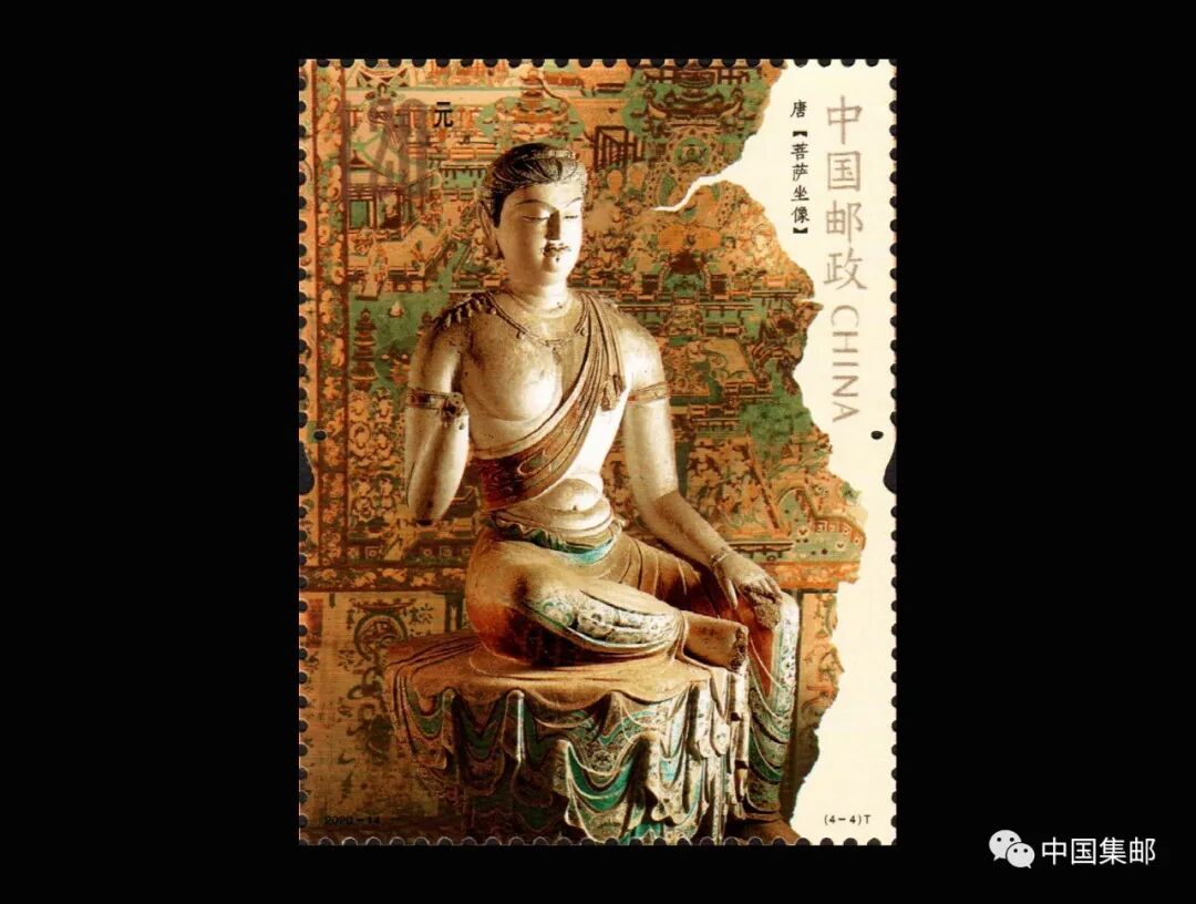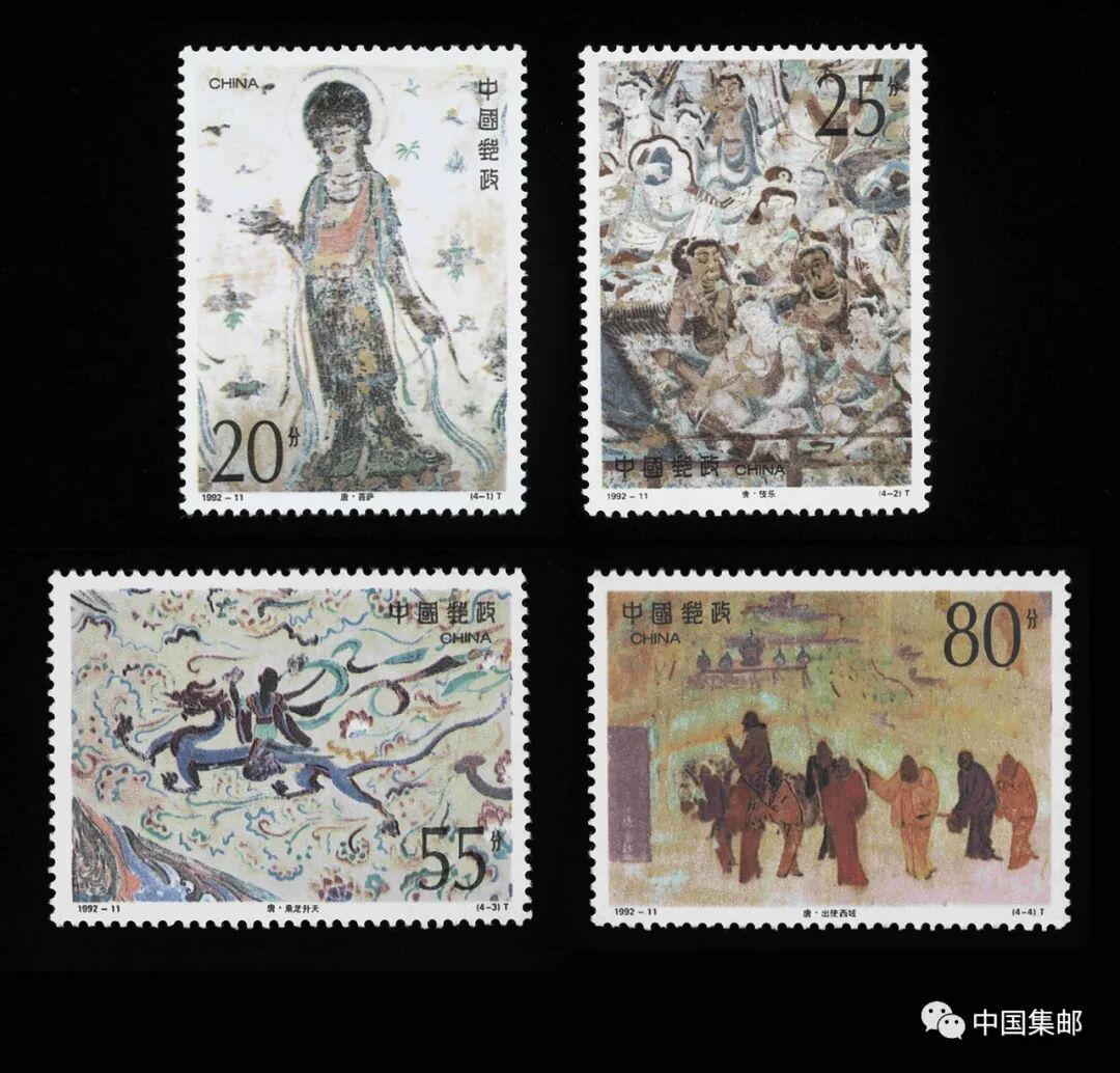 在四枚邮票和一枚小型张上分别表现了从北魏到晚唐几百年间最具有代表性的莫高窟壁画和雕塑艺术作品,彩塑佛像面容安详,姿态典雅;壁画设色浓丽,绘制精美,分别代表了这几个时代最杰出的造像艺术水准。
