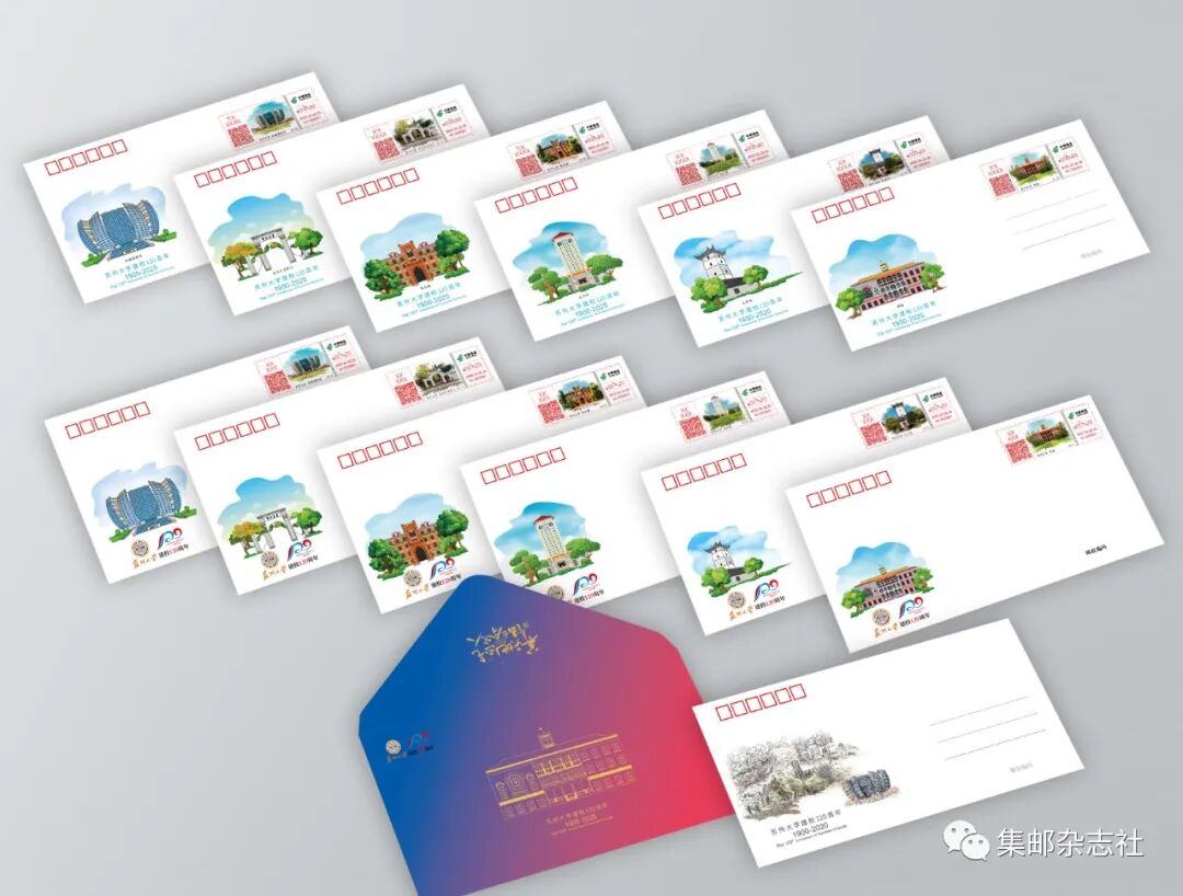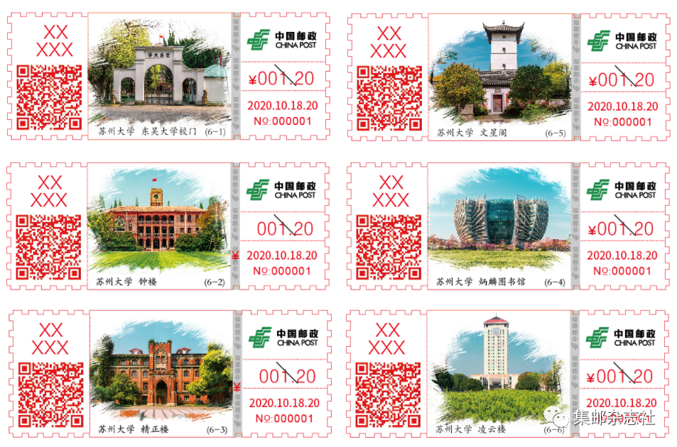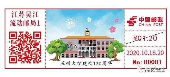 为纪念苏州大学建校120周年,经中国邮政集团有限公司批准,江苏吴江苏大未来校区临时邮局将于2020年10月18日启用“苏大风情”自助式邮资机宣传戳一组6枚,图案分别为苏州大学钟楼、精正楼、文星阁、东吴大学校门、凌云楼和炳麟图书馆。