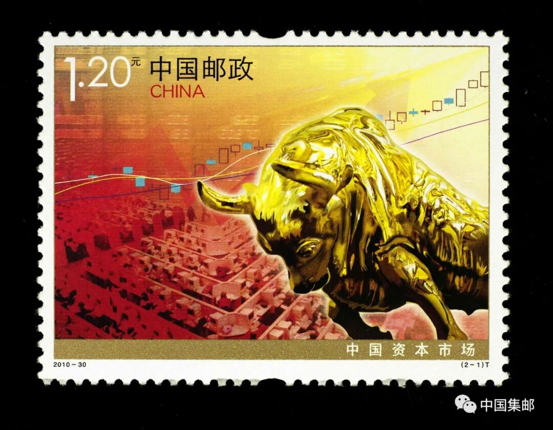 为纪念中国资本市场走过20年不平凡的春秋,中国邮政于2010年12月12日增加发行2010-30《中国资本市场》特种邮票一套2枚,邮票面值均为1.20元。第1枚名为“发展资本市场”,以金色“拓荒牛”为前景,背景为证券交易所交易大厅全景图,交易行情显示屏,以及一条K线趋势图。象征了深圳资本市场初期敢为人先的精神和开创历史的功绩。