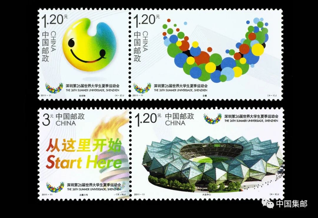 世界大学生运动会素有“小奥运”之称,由国际大学生体育联合会主办,只限在校大学生和毕业不超过两年的大学生参加。2011年8月,第26届世界大学生夏季运动会在深圳举行。中国邮政特发行纪念邮票一套4枚,图案分别是会徽、吉祥物、大运中心、主题口号。本次世大会的会徽“欢乐的U”由大大小小的彩色圆点组成,既代表大学(University),你(you),团结(United),世界(Universe),也可以从形象上理解为微笑,微微上翘的弧度还象征着深圳的海湾,既包容又开放,体现了深圳世界大学生夏季运动会欢乐、开放、包容、青春、未来的主题。中国代表团在此次大运会上凭借75枚金牌、145枚奖牌的战绩超越了前苏联在1973年大运会创造的69金纪录,成为历史上在单届大运会夺得金牌最多的国家。