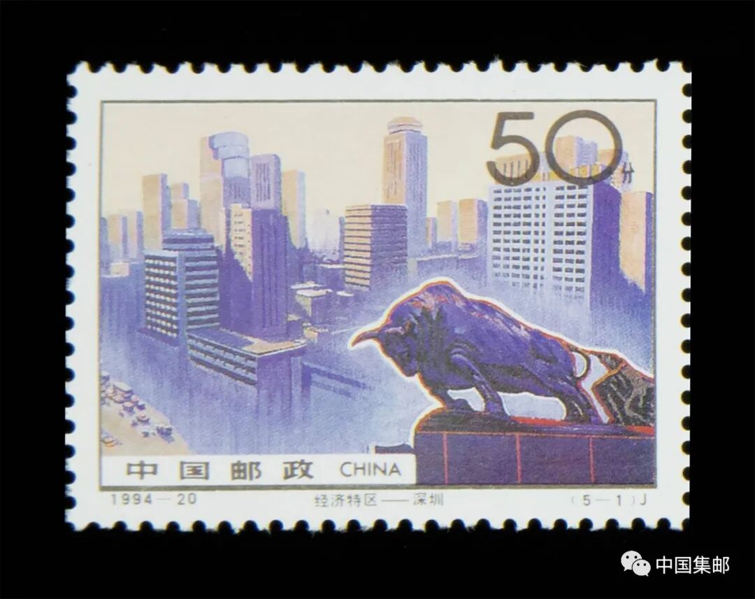 2000年,中国邮政发行《深圳经济特区建设》特种邮票一套5枚,分别描绘了深圳金融中心区、深圳中国国际高新技术成果交易会展览中心场馆、深圳市盐田港区、深圳湾旅游区、深圳蛇口工业区的景象,全面展现了深圳经济特区建设20年的成果。这是新中国邮票第一次专门将深圳经济特区作为主题。这套邮票最大的特色是写实。5枚邮票均以碧海蓝天作为基调,既反映出深圳临海的独特地理优势,也对应了国务院要求深圳建设为现代化滨海城市这一城市形象目标。总体上使票面的深圳城市景观更加突出。每一枚票的右下角都用金黄-红色醒目的突出了深圳标志性建筑“拓荒牛”的剪影,使得画面更加生动活泼。