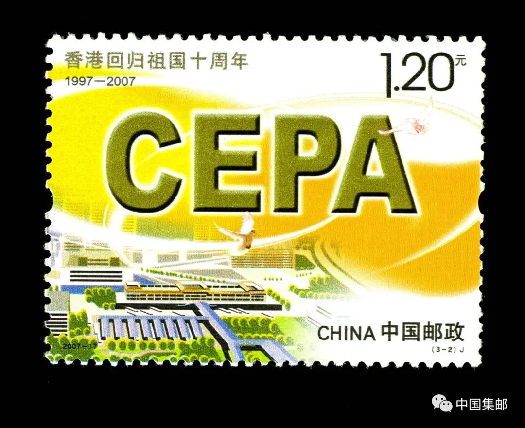 早在2007年发行的纪念邮票《香港回归祖国十周年》的邮票画面中,就出现了深圳皇岗口岸、西部通道大桥等深圳元素。图2名为“合作”,中间显眼的CEPA是“内地与香港关于建立更紧密经贸关系安排”的英文简称。它的实施大大促进了内地与香港两地经济的协调发展,实现双赢的局面。为两地经济交流与合作提供了一个制度化的安排,对香港经济社会的长远发展和“一国两制”的未来实践有着深远的影响。