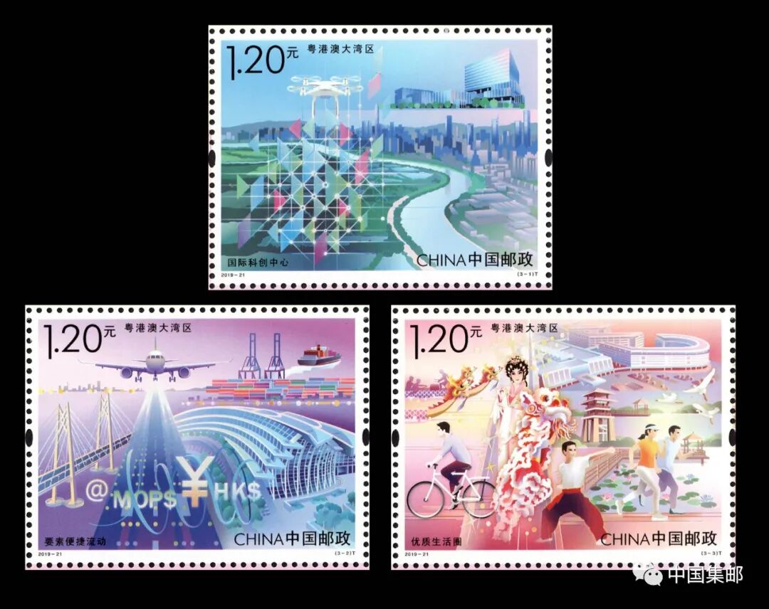 2019年9月,中国邮政发行《粤港澳大湾区》特种邮票一套3枚,小全张1枚。第一图“国际科创中心”画面中央深圳河蜿蜒纵深,左侧是港深创新科技园;“要素便捷流动”。第三图“优质生活圈”中印有香港大学深圳医院和醒狮、龙舟等岭南文化特色,配以湿地公园和健身的市民,体现大湾区以人为本,发展优质生活圈的愿景。小全张下方边纸还有深圳平安金融中心的勾勒图案。