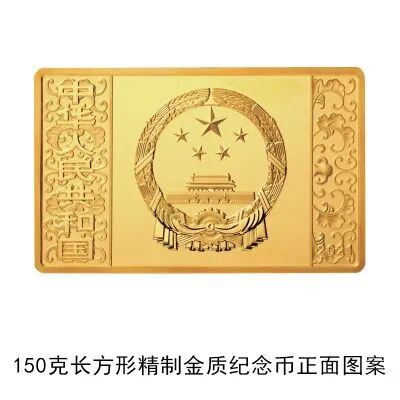 (五)150克长方形金质纪念币为精制币,含纯金150克,规格64毫米×40毫米,面额2000元,成色99.9%,最大发行量600枚。