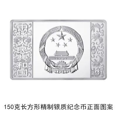 (十一)150克长方形银质纪念币为精制币,含纯银150克,规格80毫米×50毫米,面额50元,成色99.9%,最大发行量5000枚。