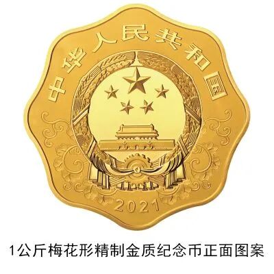 (三)1公斤梅花形金质纪念币为精制币,含纯金1公斤,外接圆直径100毫米,面额10000元,成色99.9%,最大发行量118枚。