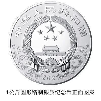 (十)1公斤圆形银质纪念币为精制币,含纯银1公斤,直径100毫米,面额300元,成色99.9%,最大发行量5000枚。