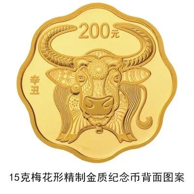 15克梅花形金质纪念币背面图案为装饰牛造型。