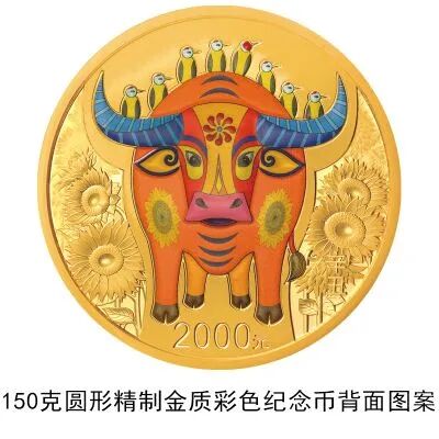 150克圆形金质彩色纪念币背面图案为装饰牛造型衬以向日葵等组合设计(局部彩色)。