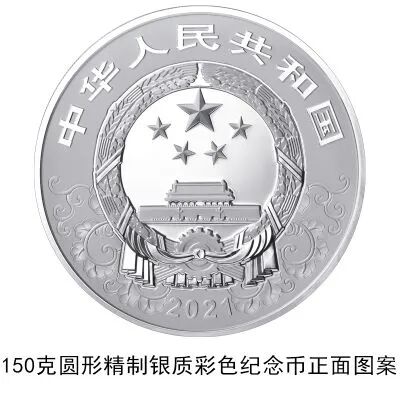 (十二)150克圆形银质彩色纪念币为精制币,含纯银150克,直径70毫米,面额50元,成色99.9%,最大发行量10000枚。