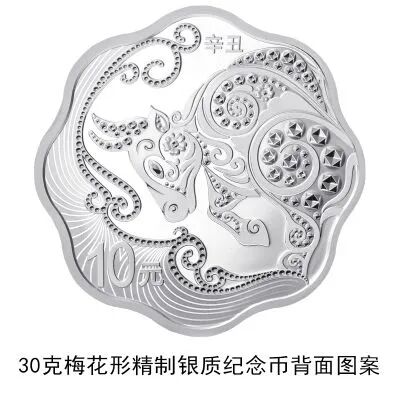 1公斤梅花形金质纪念币、1公斤圆形银质纪念币、30克梅花形银质纪念币背面图案均为装饰牛造型衬以装饰纹样。