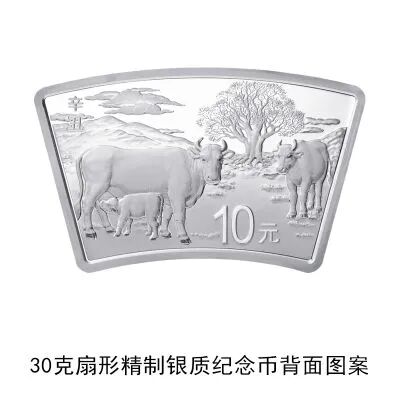 150克长方形金质纪念币、150克长方形银质纪念币、30克扇形银质纪念币背面图案均为写实牛造型,衬以树、远山等组合设计。