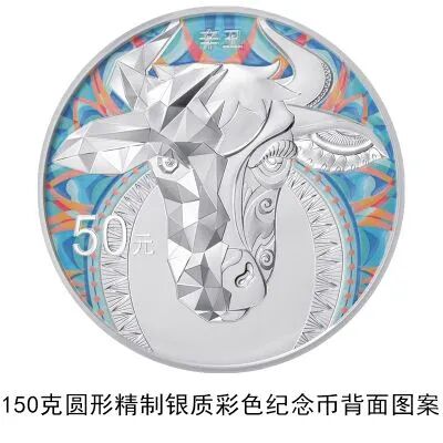 150克圆形银质彩色纪念币背面图案为装饰牛头造型衬以装饰纹样(局部彩色)。
