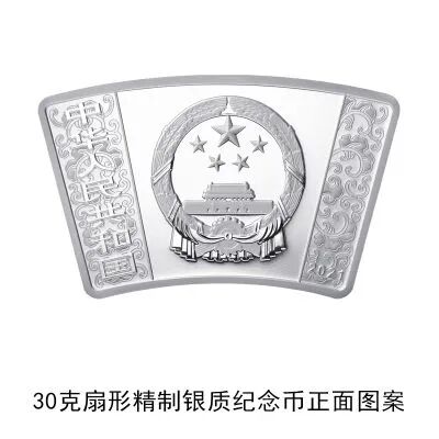 (十四)30克扇形银质纪念币为精制币,含纯银30克,外圆半径85毫米,内圆半径60毫米,圆心角30度,面额10元,成色99.9%,最大发行量30000枚。