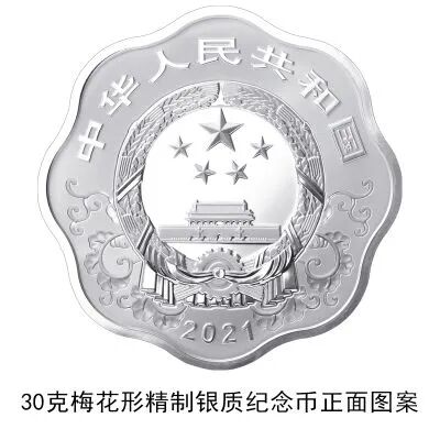 (十三)30克梅花形银质纪念币为精制币,含纯银30克,外接圆直径40毫米,面额10元,成色99.9%,最大发行量50000枚。