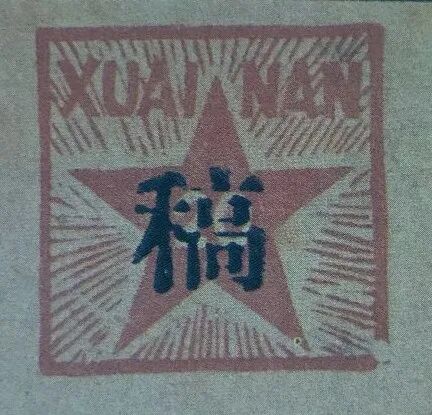 1943年初,新路东报社与淮南交通总站协商,在邮票上印“稿”字免费发给报社通讯员和记者投送新闻稿件贴用,邮资由报社支付。“稿”字邮票由此诞生,全套1枚。在用纸非常紧张的情况下,《新路东》(1944年改名《淮南日报》)报社使用抄收新华社电讯稿的电报纸(小32开新闻纸)的背面(电报数码、译文还清晰可见),用绿色五角星图邮票的原版改刷成大红色、在中央面值“20”分处加盖黑色宋体“稿”字。此票虽为木刻版,但其设计严谨,刀法流畅,在两千多种区票中显得极为独特。